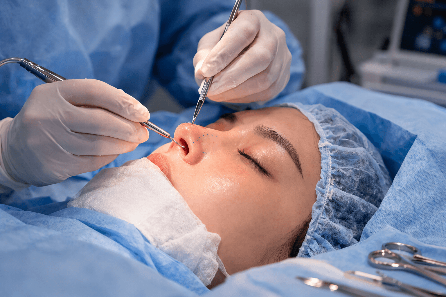 แพทย์ใน plastic surgery clinic จะประเมินโครงสร้างจมูกและรูปหน้าเพื่อเลือกเทคนิคที่เหมาะสมที่สุด